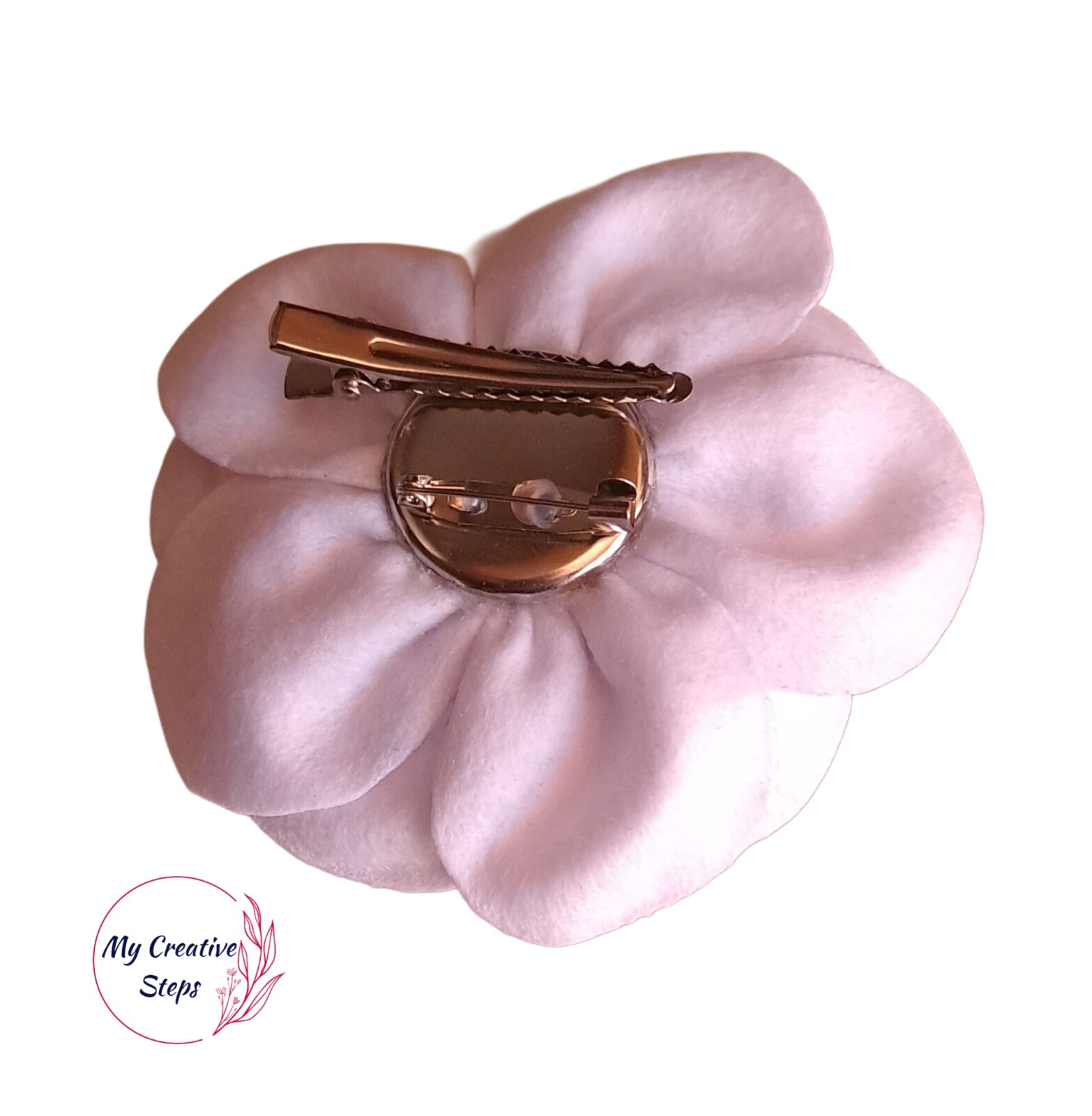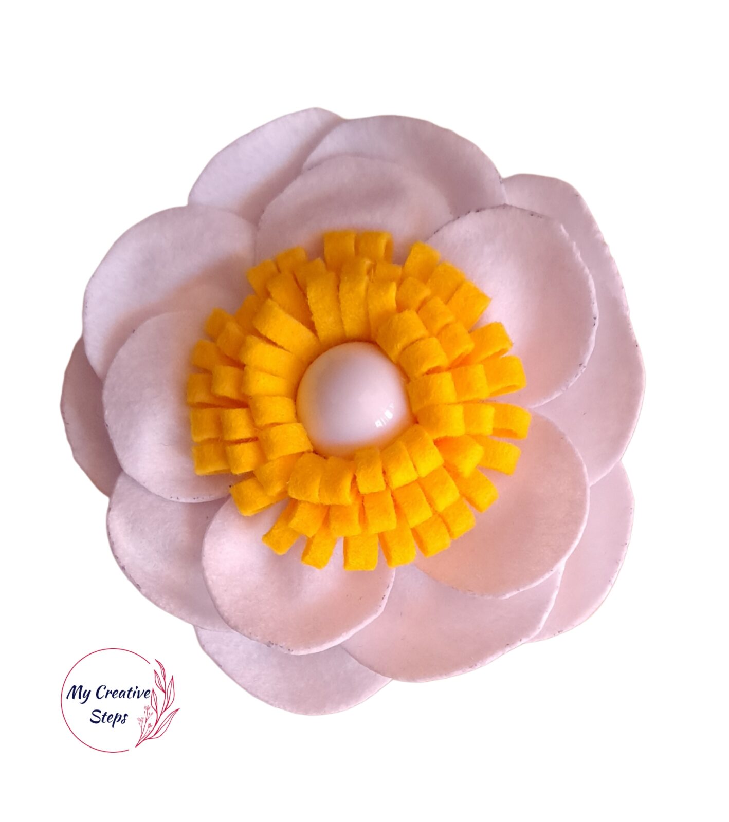 Broșă  handmade din fetru alb și portocaliu cu bilă pe mijloc. Dimensiune, aprox. 9 cm. Poate fi folosit și ca accesoriu de păr.