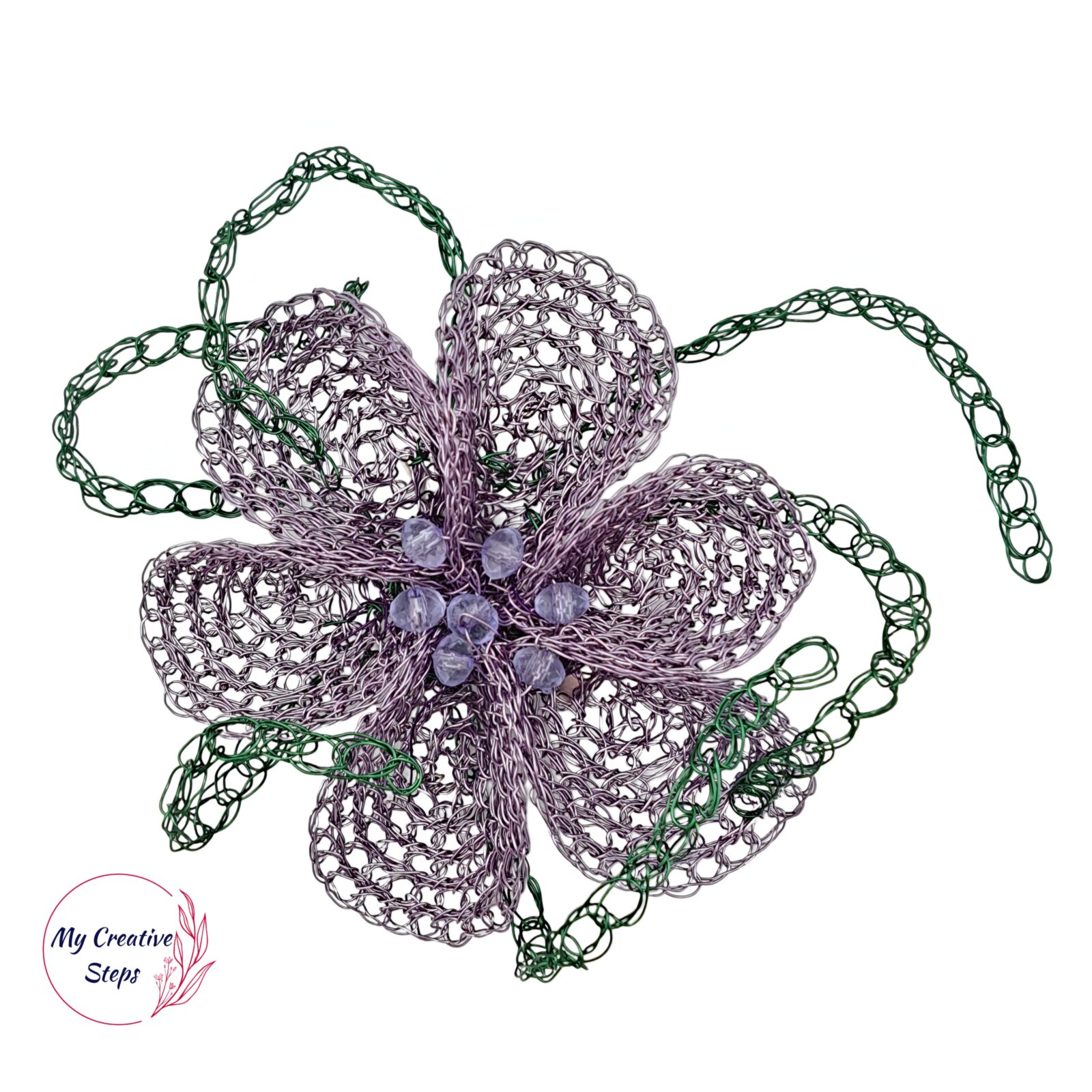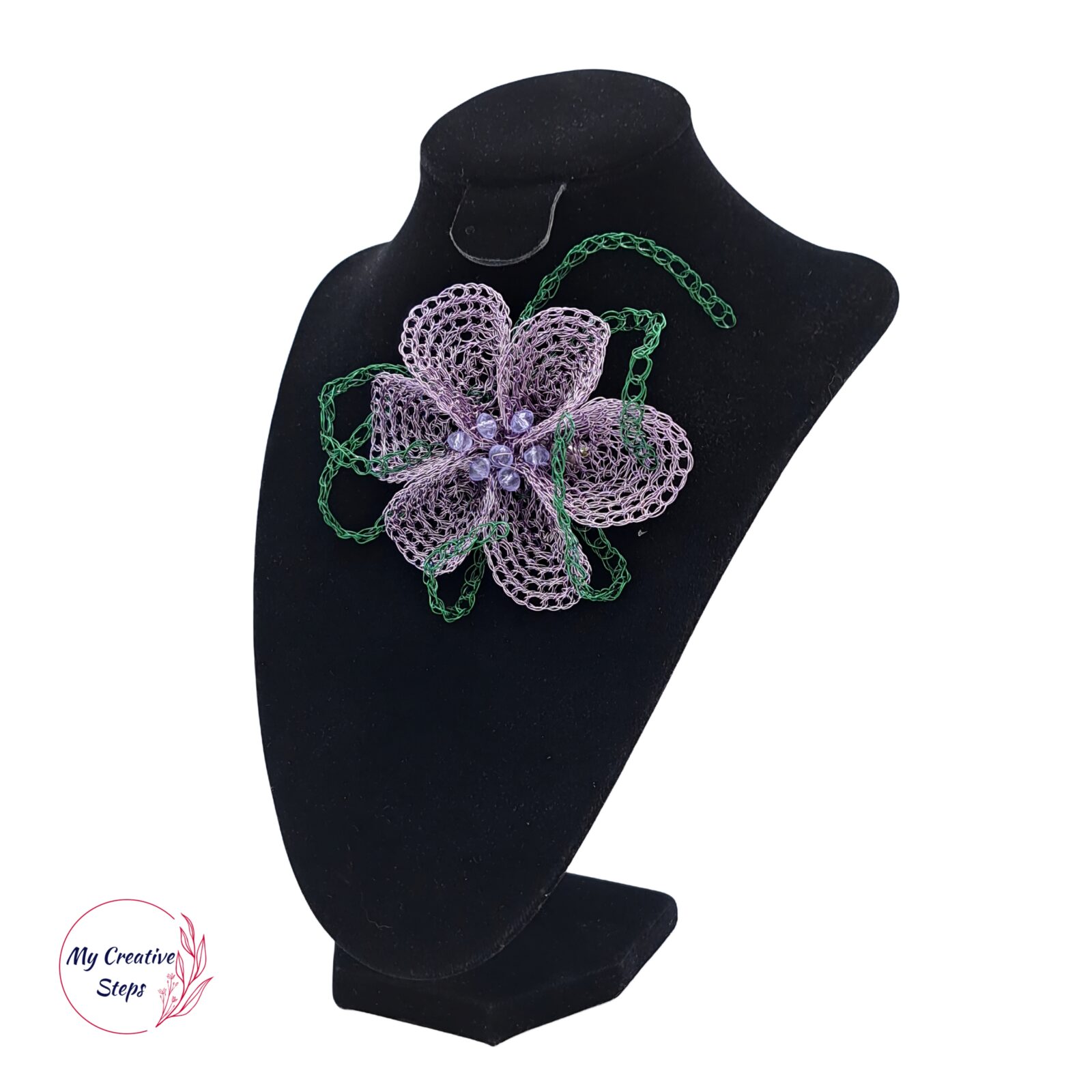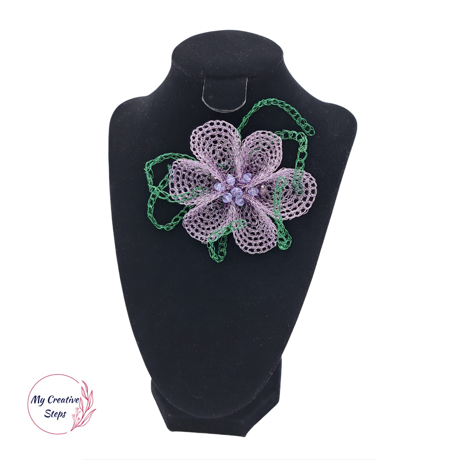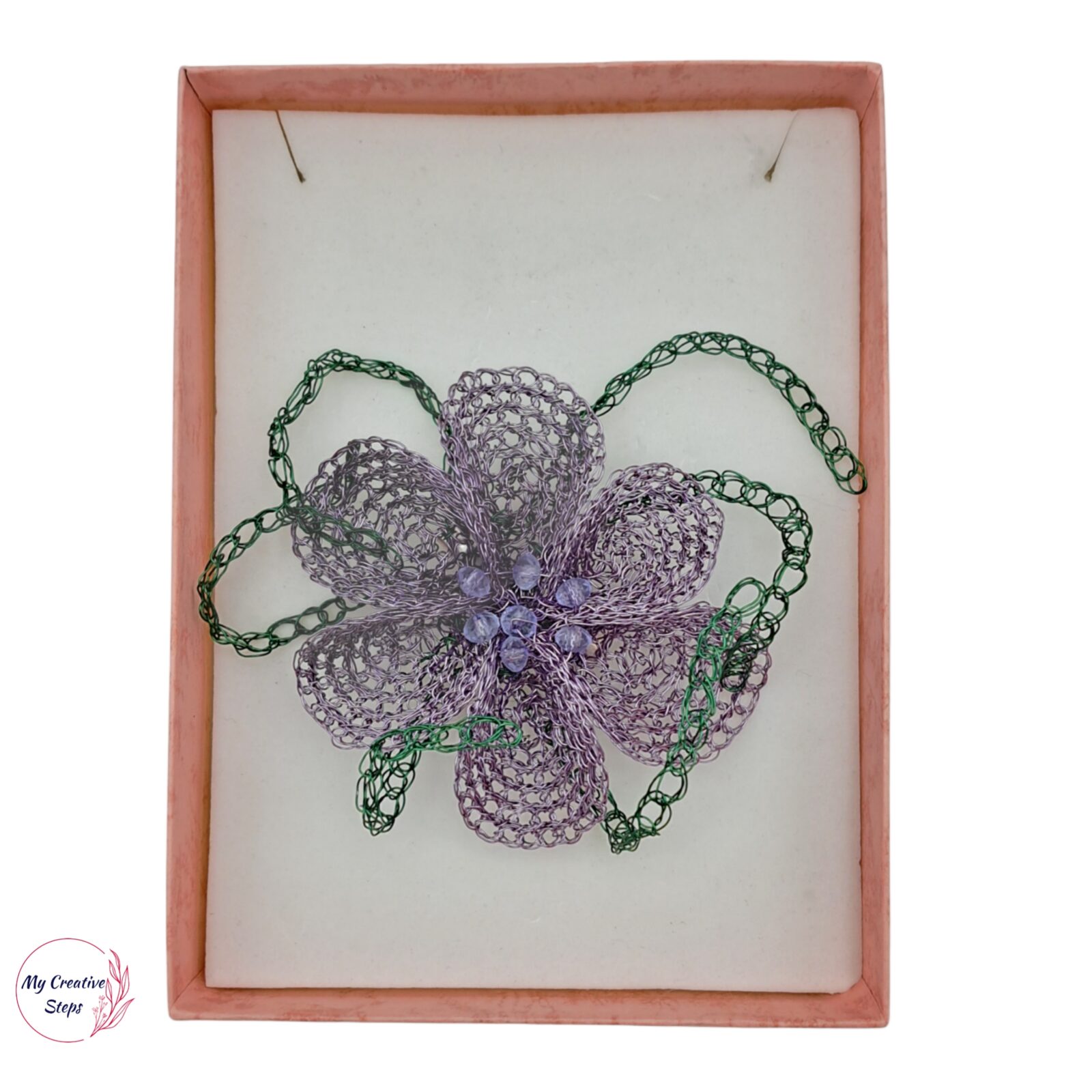 Broșă handmade realizată prin croșetarea sârmei de cupru, tratată anticorodare și emailată. Diametru aprox. 9 cm.