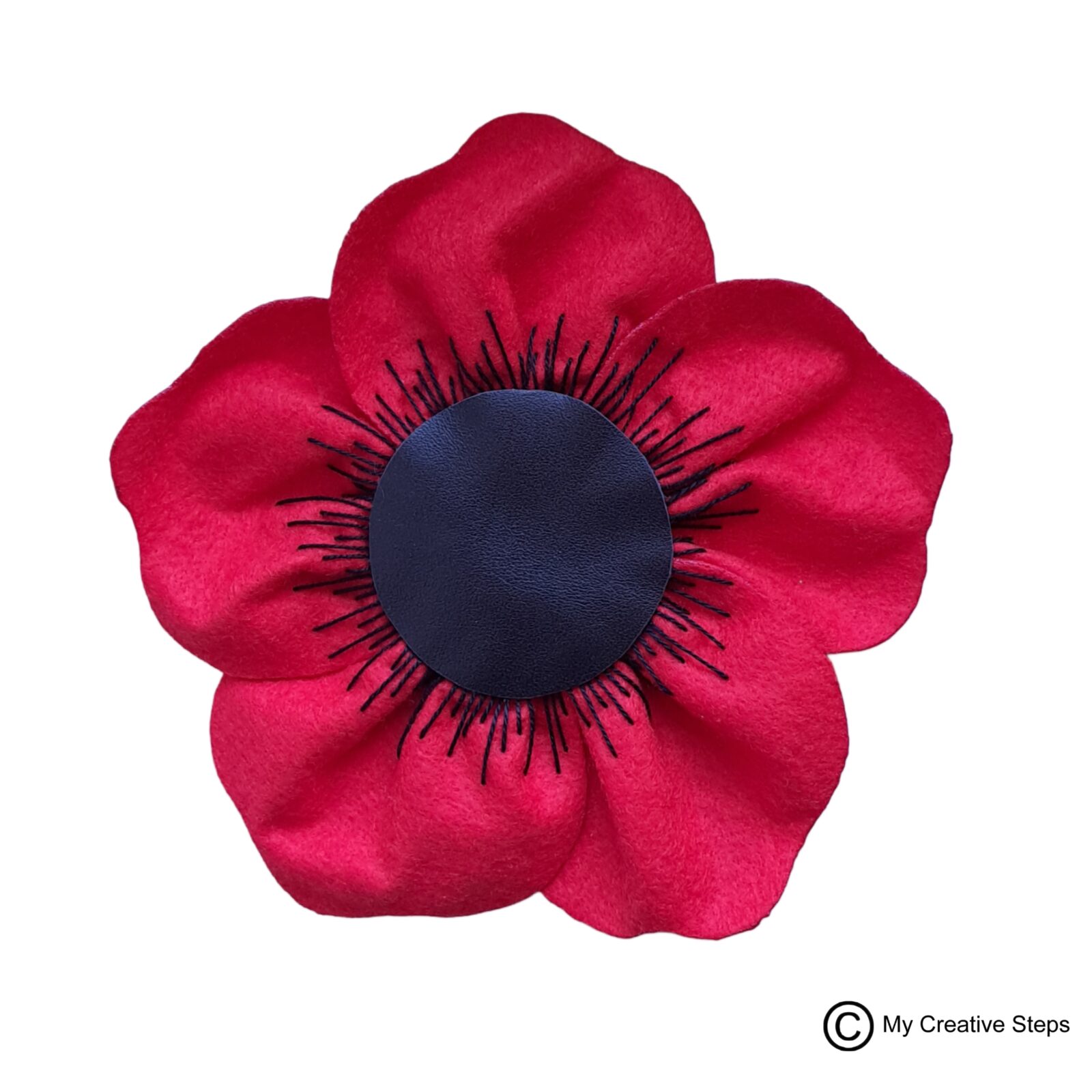 Broșă handmade din fetru roșu cu piele neagră pe mijloc. Diametru aprox. 12 cm.