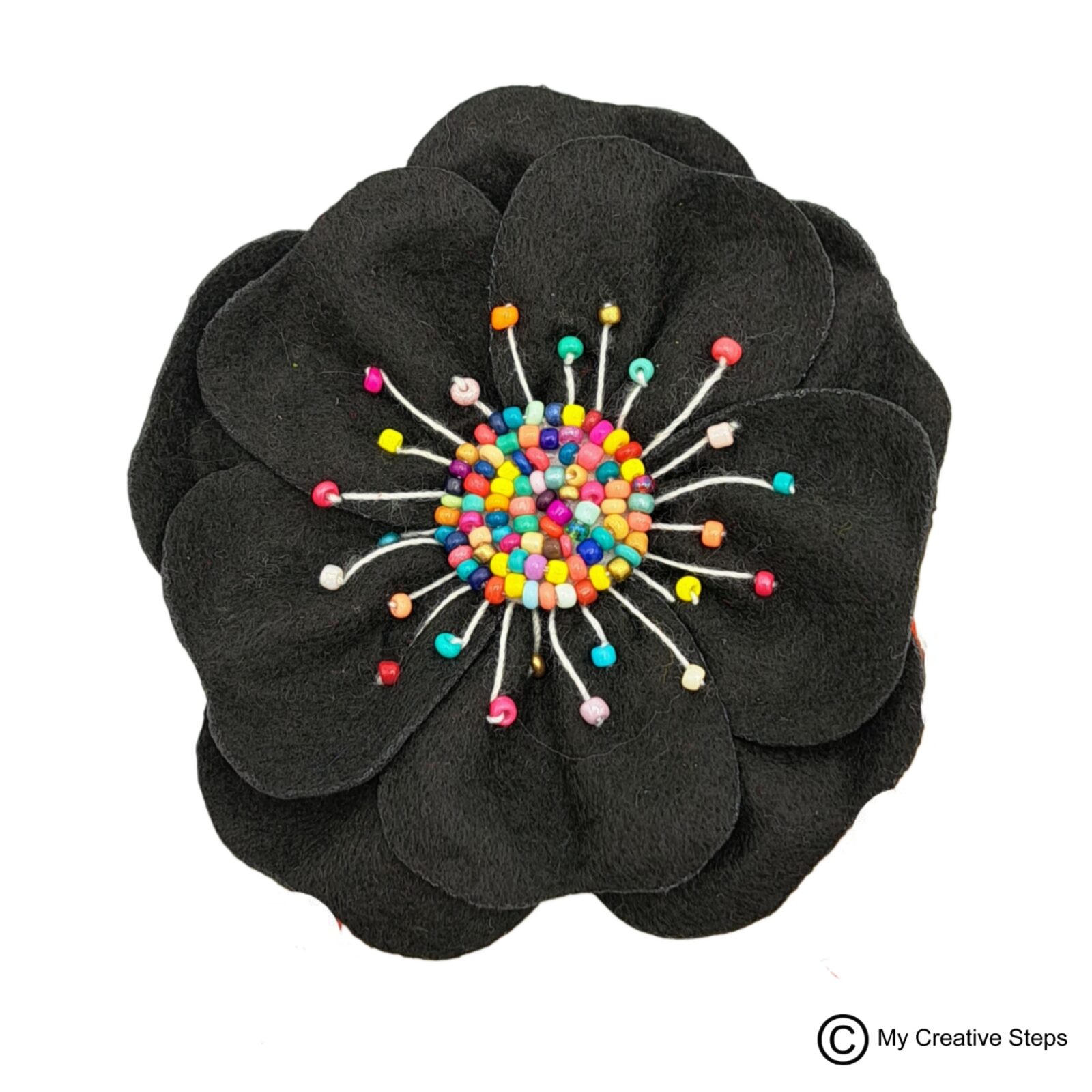 Broșă handmade din două straturi de fetru negru cu mărgele multicolore pe mijloc. Diametru aprox. 8 cm.