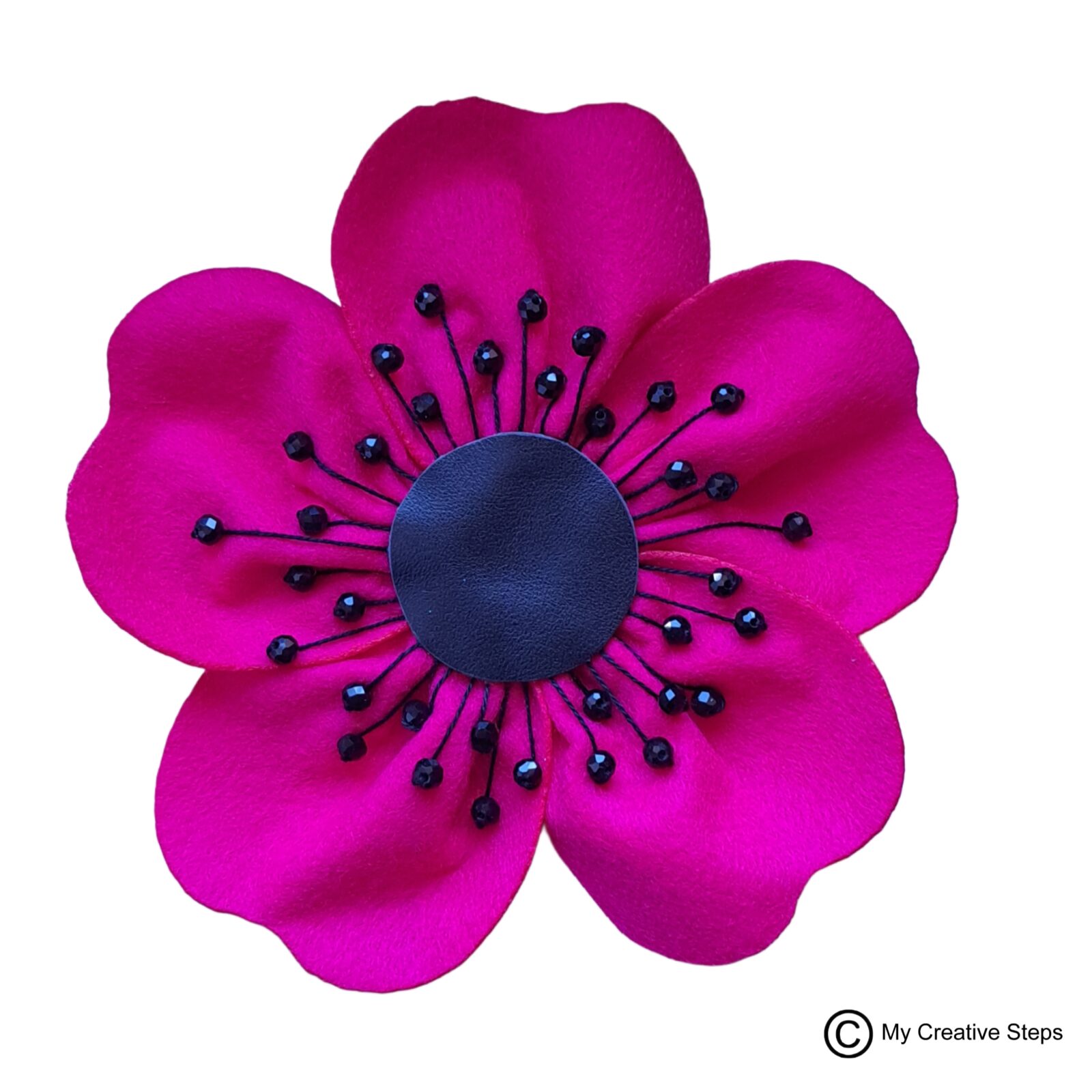 Broșă handmade din fetru roșu cu piele și margele negre pe mijloc. Diametru aprox. 13 cm.