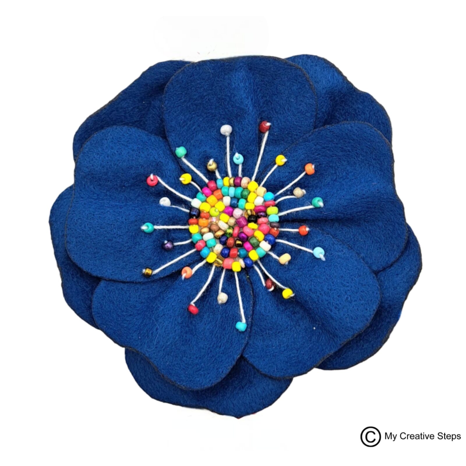 Broșă handmade mac din două straturi de fetru bleumarin cu mărgele colorate pe mijloc. Diametru aprox. 9 cm.