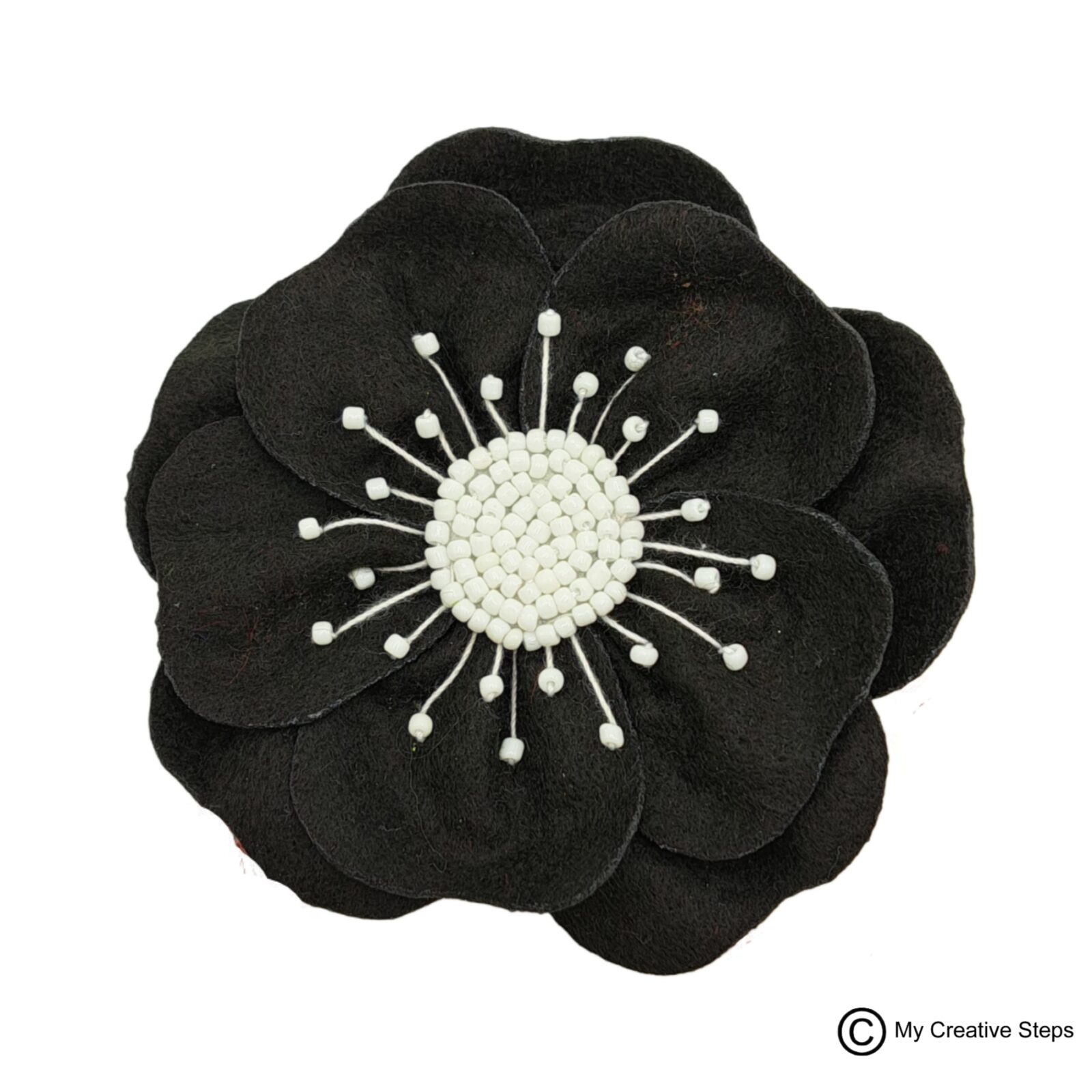 Broșă handmade mac din două straturi de fetru negru cu mărgele albe pe mijloc. Diametru aprox. 8.5 cm.