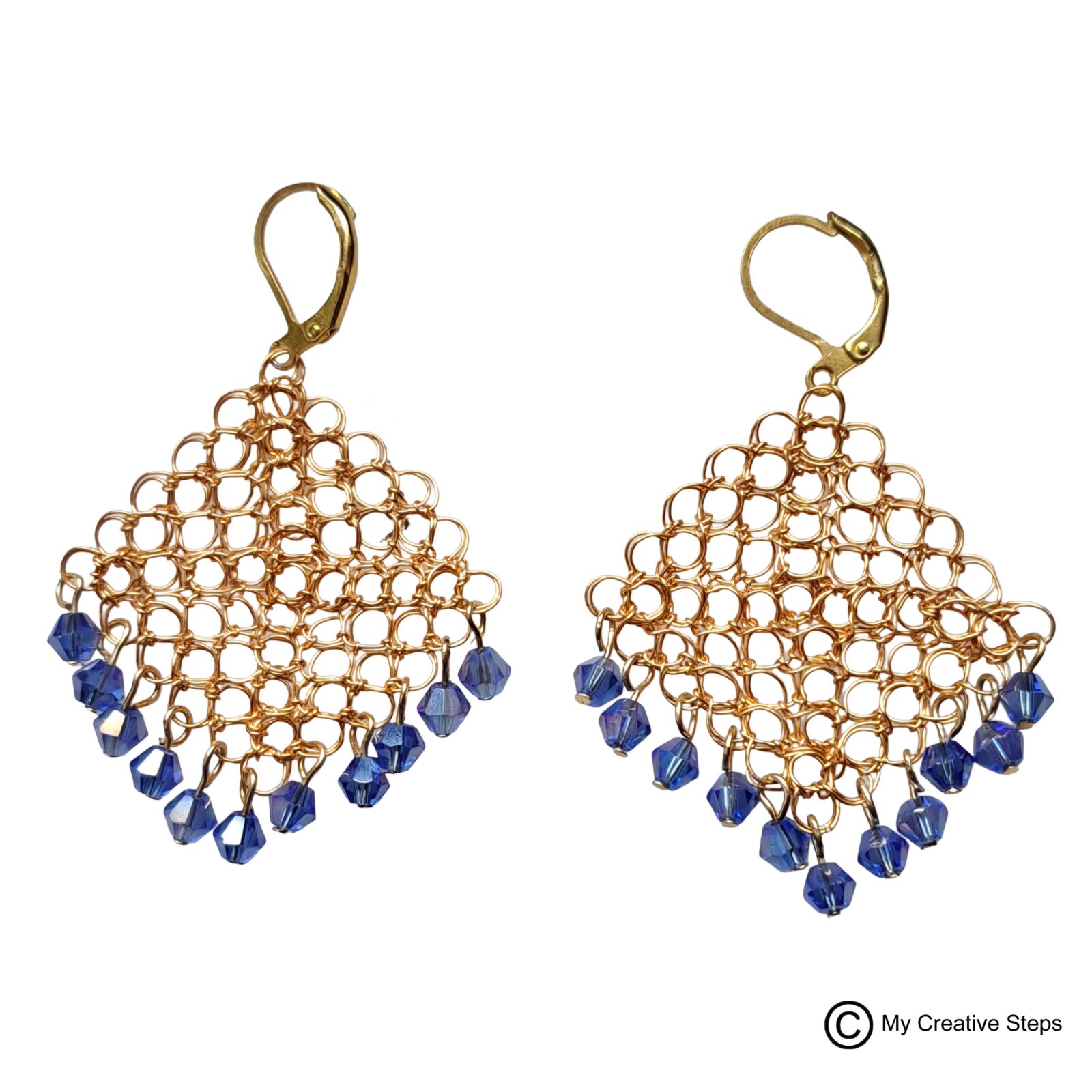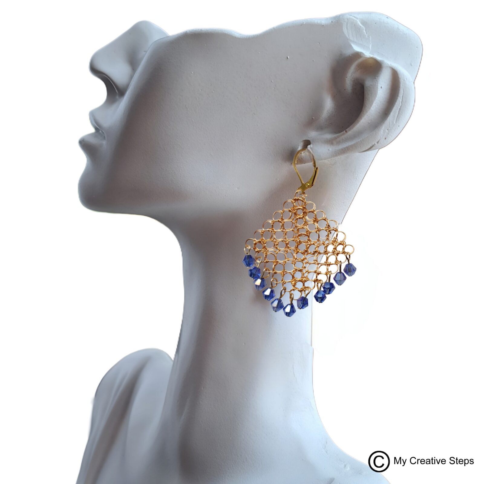 Cercei handmade realizați prin croșetarea sârmei de cupru aurie tratată anticorodare și emailată și mărgeluțe din sticlă albastră. Lungime aprox. 6 cm, latura 2.5/2.5 cm.