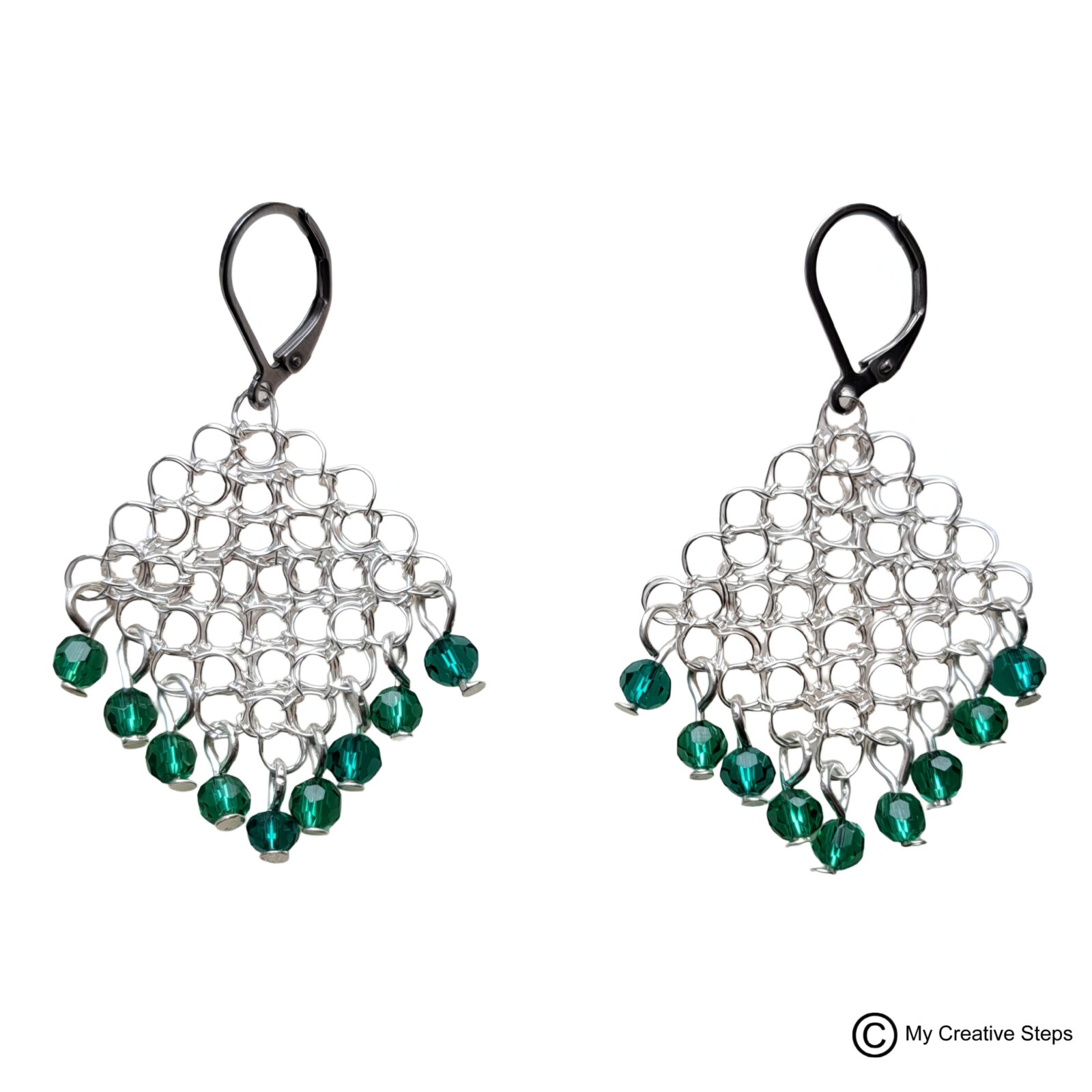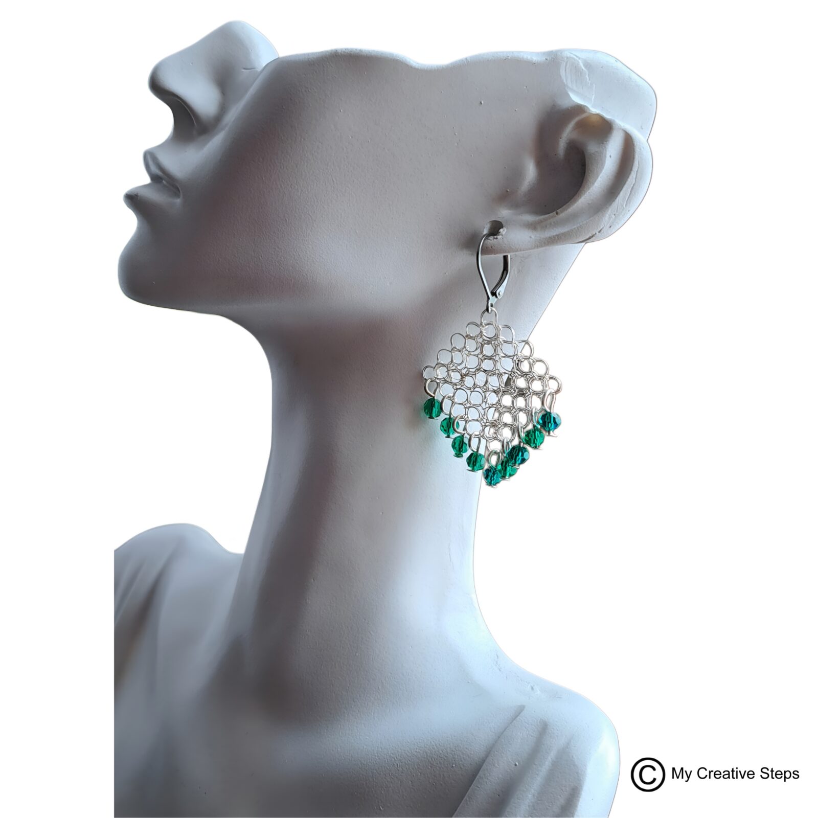 Cercei handmade realizați prin croșetarea sârmei de cupru argintie tratată anticorodare și emailată și mărgeluțe din sticlă verde. Lungime aprox. 6 cm, latura 2.5/2.5 cm.