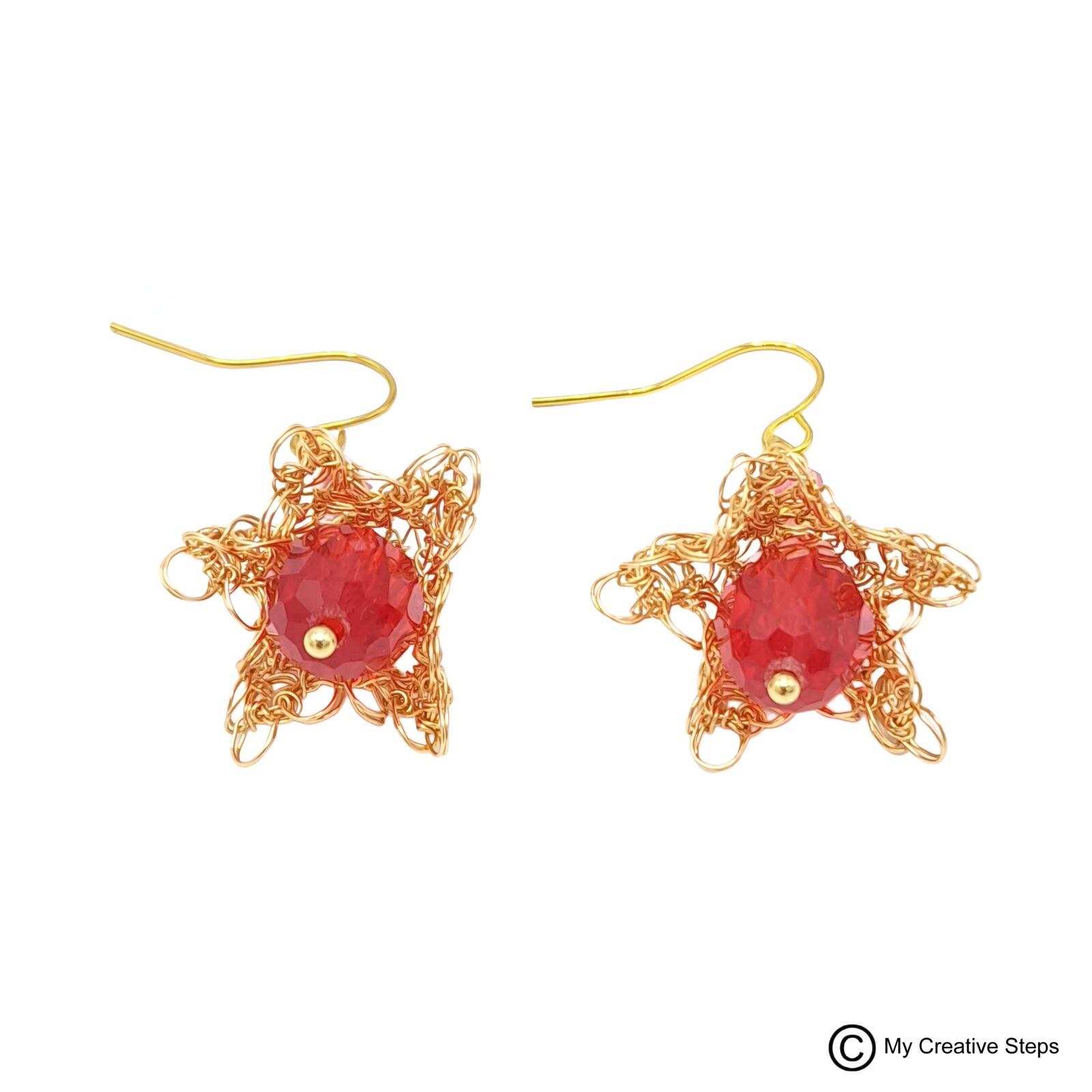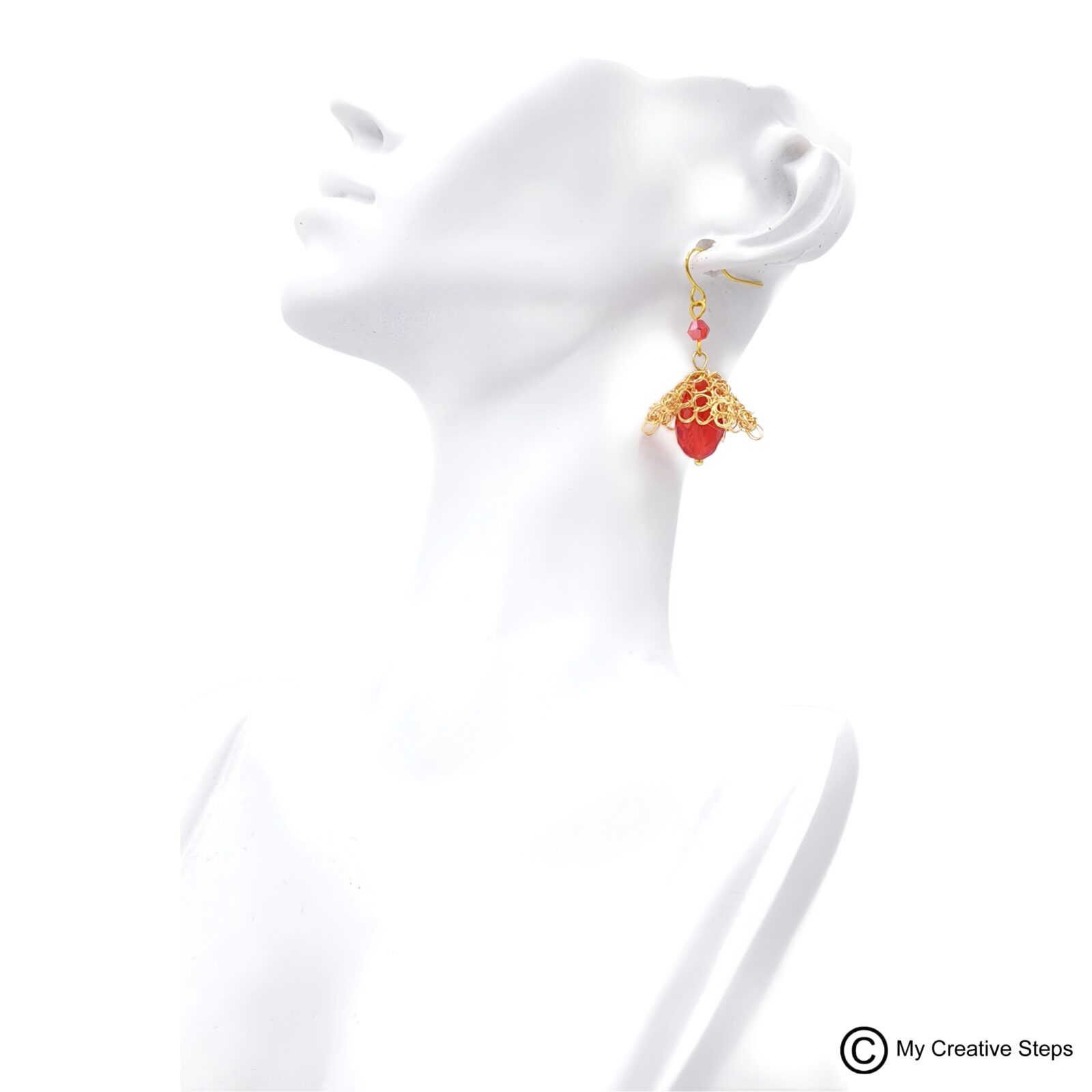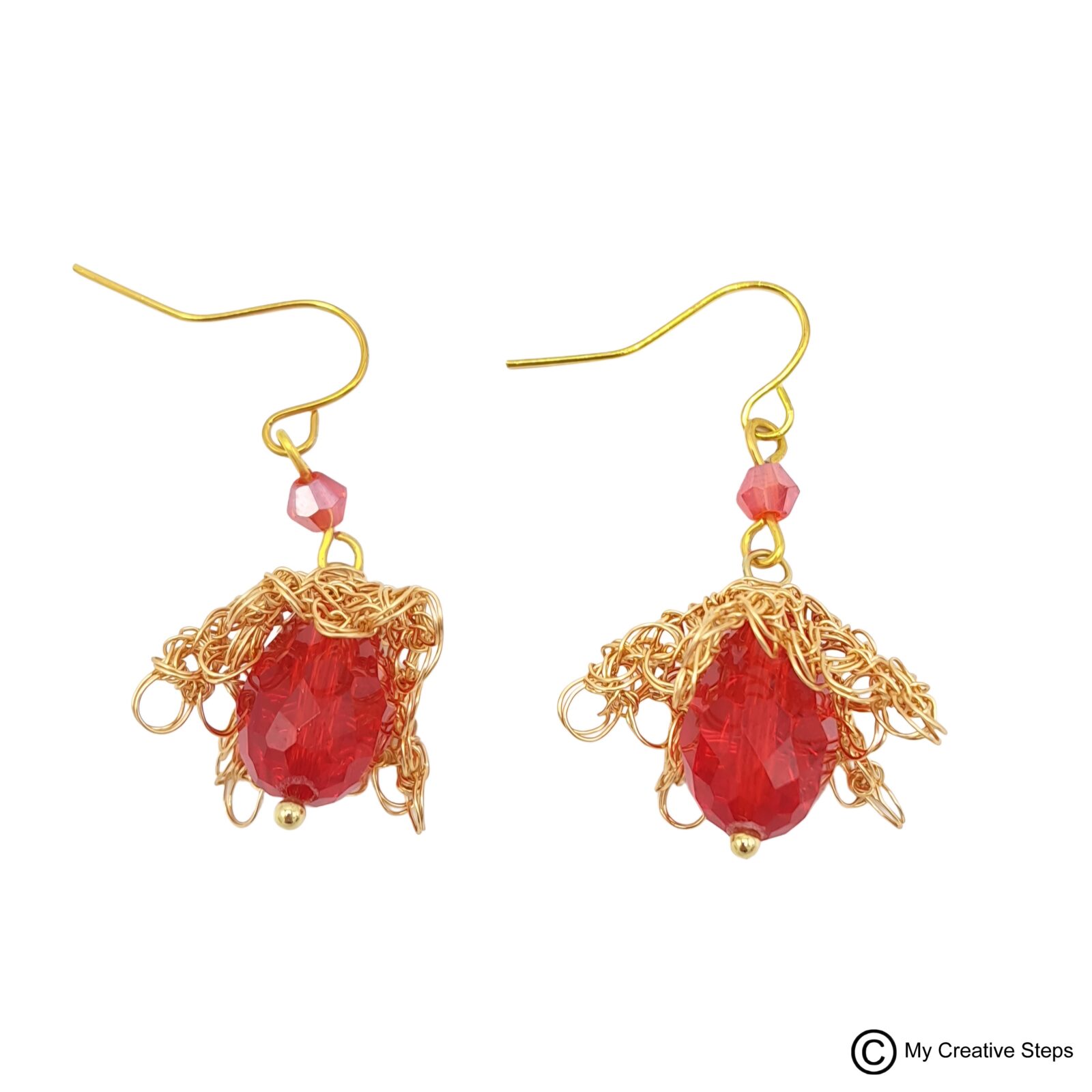 Cercei handmade clopoțel realizați prin croșetarea sârmei de cupru aurie, tratată anticorodare și emailată și mărgele roșii. Lungime aprox. 4 cm.