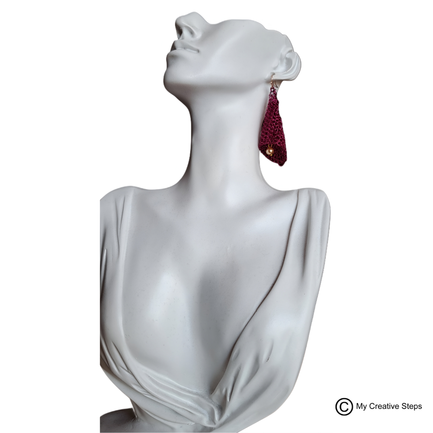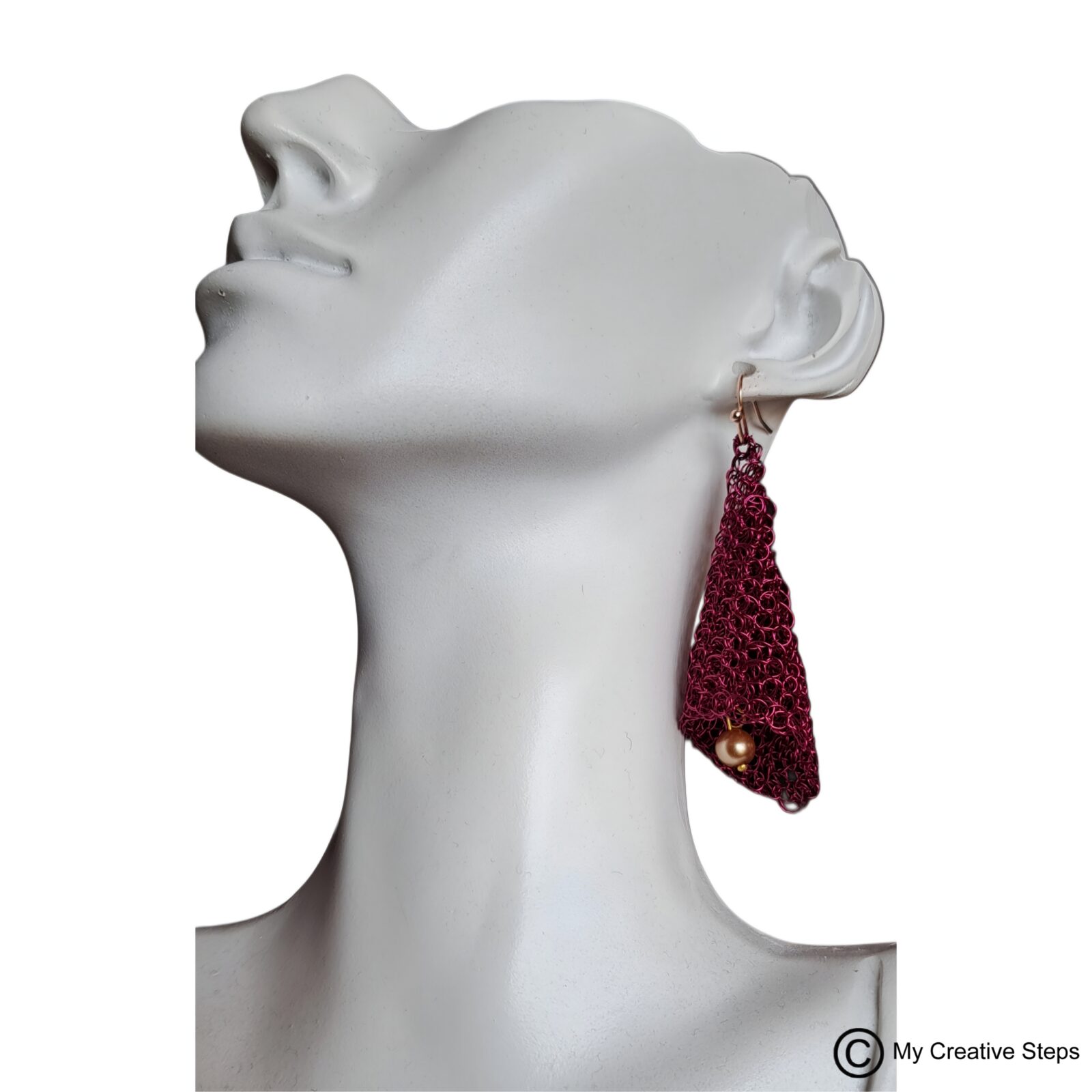 Cercei handmade „Kalla” realizați prin croșetarea sârmei de cupru grena, tratată anticorodare și emailată. Lungime aprox. 8.5 cm.