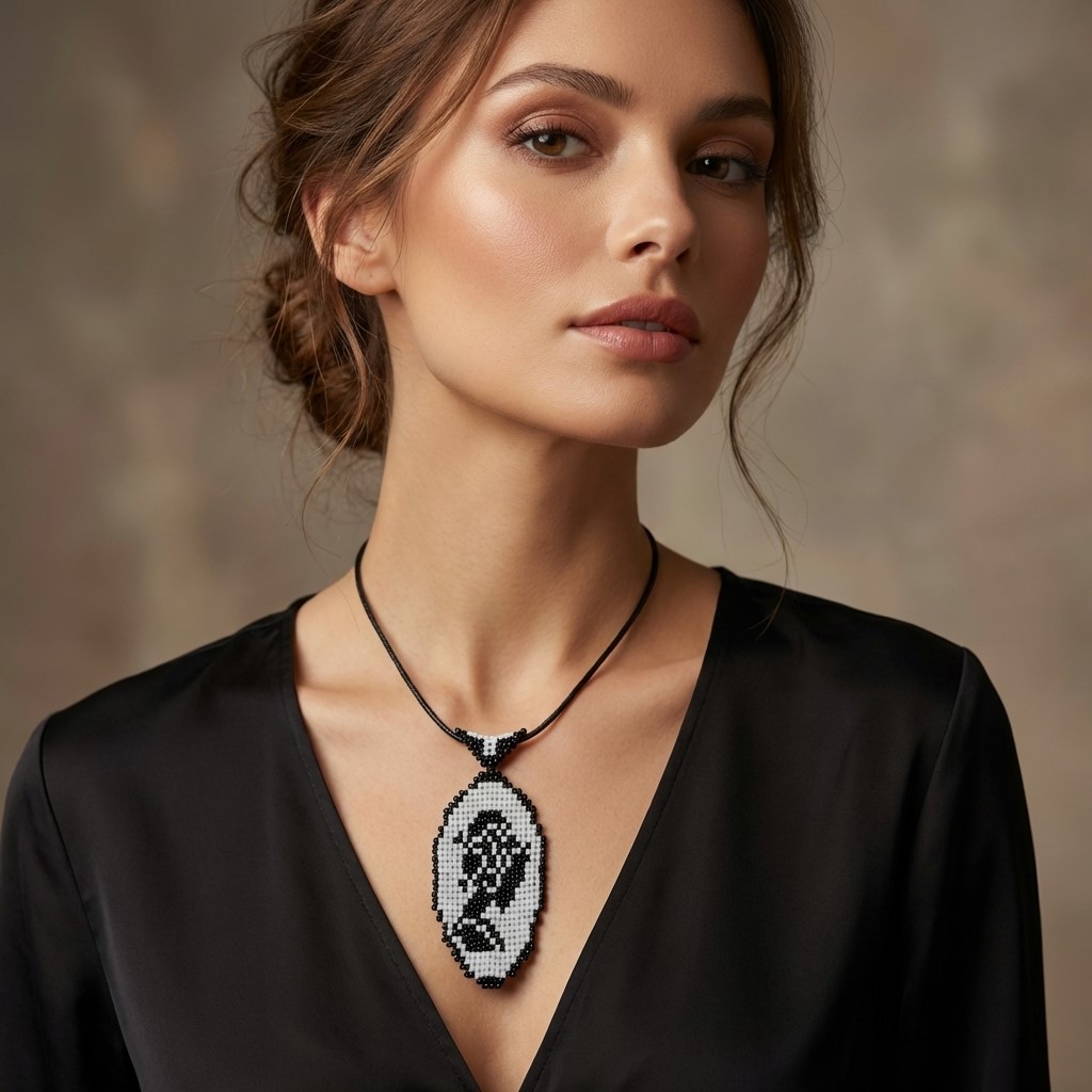 Colier handmade camee compus din pandantiv și lanț de prindere. Pandantivul este realizat din mărgele japoneze Toho cusute cu fir special extrem de rezistent în tehnica squarestitch. Lanțul de prindere este din piele și închiderea din oțel INOX. Lungime pandantiv 8.5 cm, lățime 3.5 cm. Lungime lanț 45 cm.