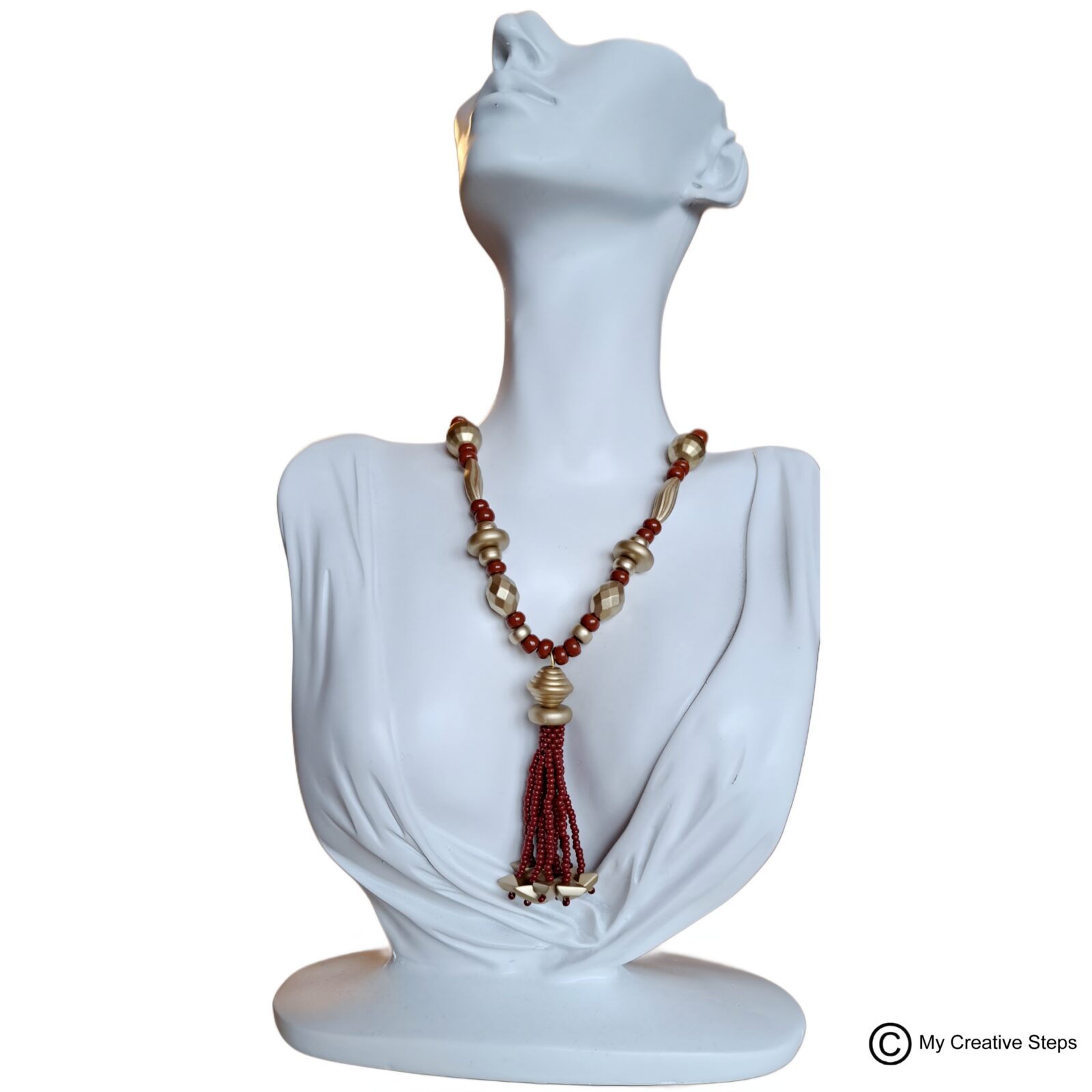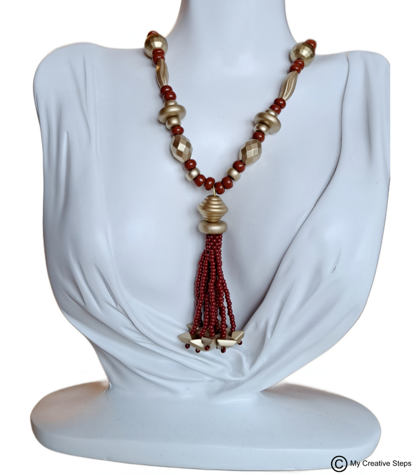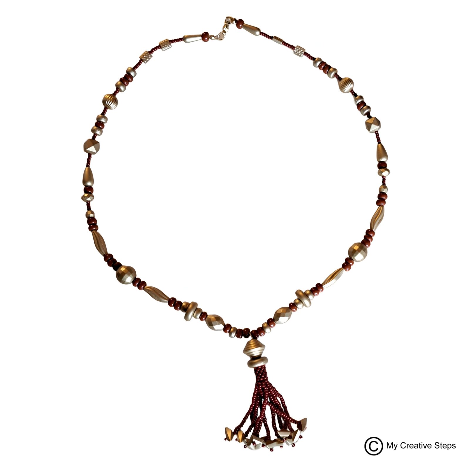 Colier handmade boho chic. Este realizat din mărgele acrilice, mărgeluțe cehești Preciosa Ornela de culoare maro și auriu. Lungime pandantiv 7.5 cm. Închiderea este din oțel INOX. Lungime șnur 57 cm.