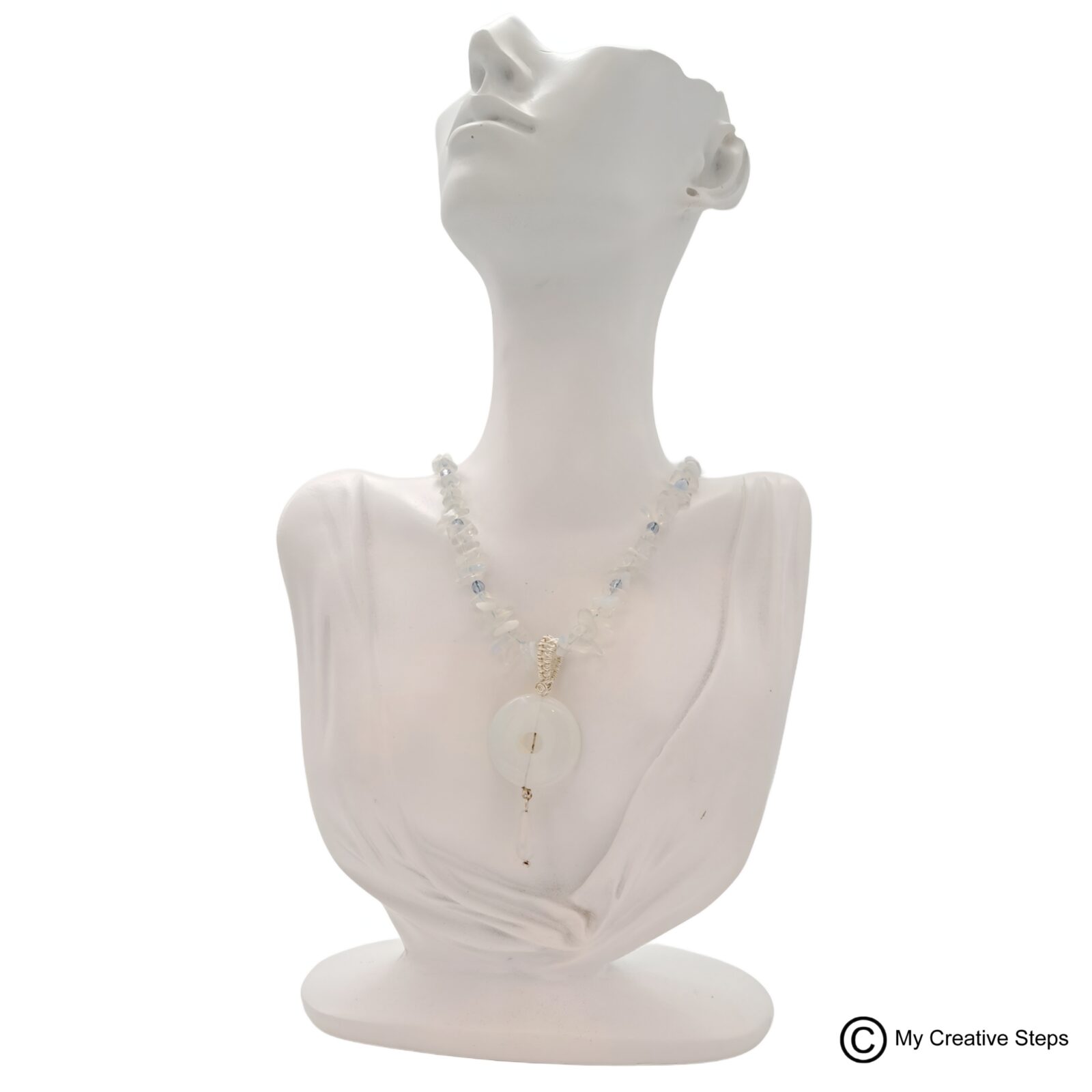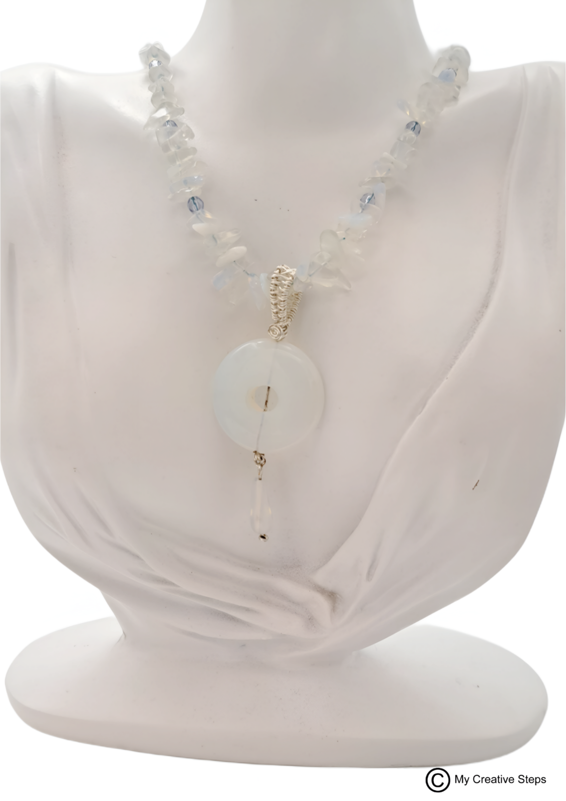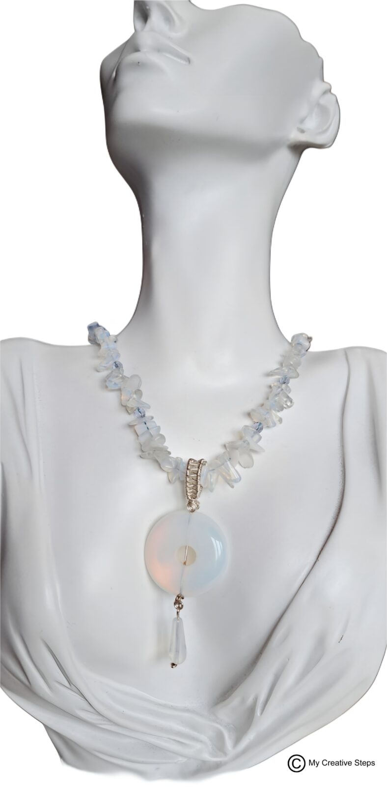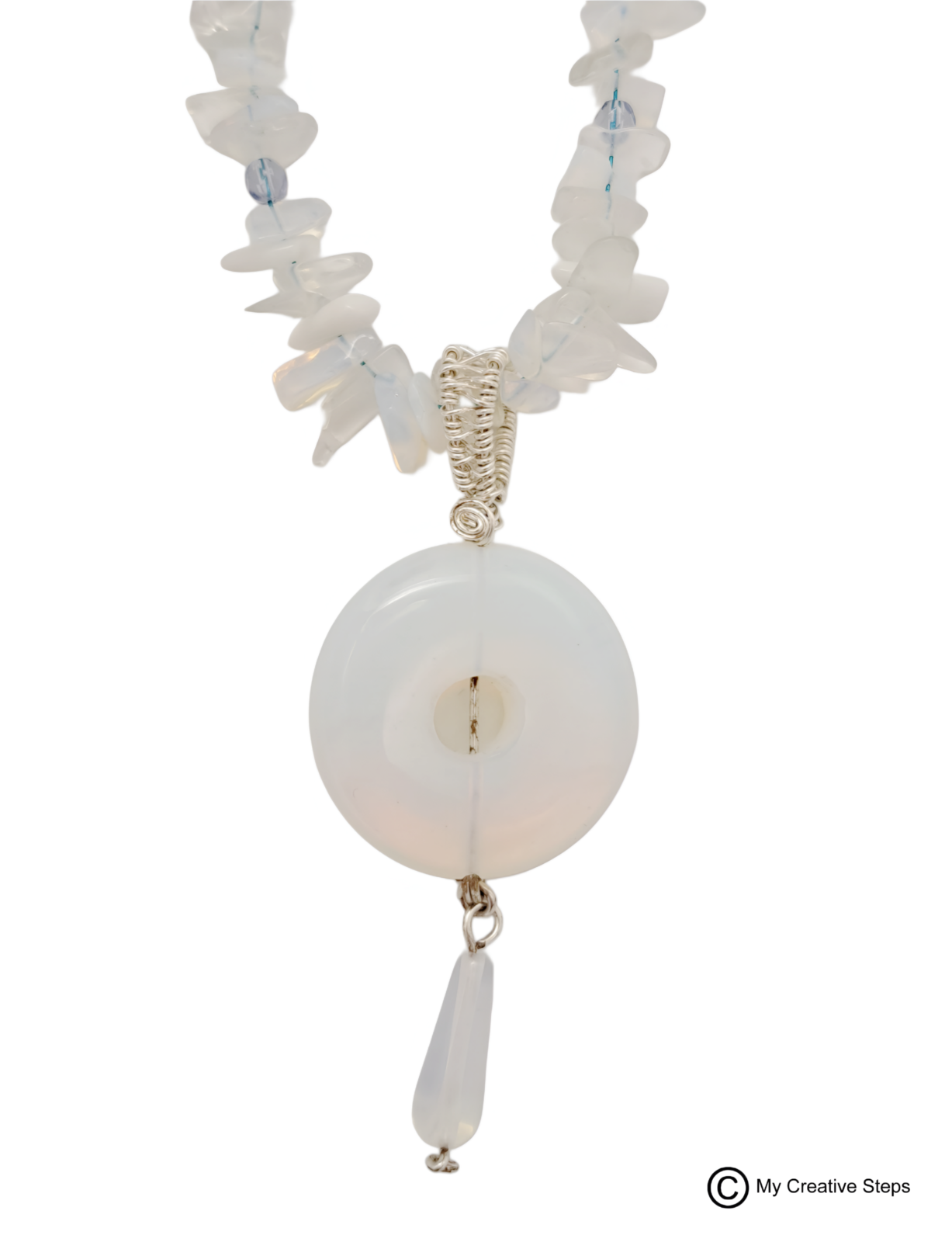 Colier handmade din pietre semiprețioase de OPALIT. Este realizat din cipsuri și pandantiv donat din OPALIT și sârmă argintat. Lungime pandantiv 7.5 cm, diametru 3 cm. Lungime șnur apox. 51 cm. Închiderea este din oțel INOX.