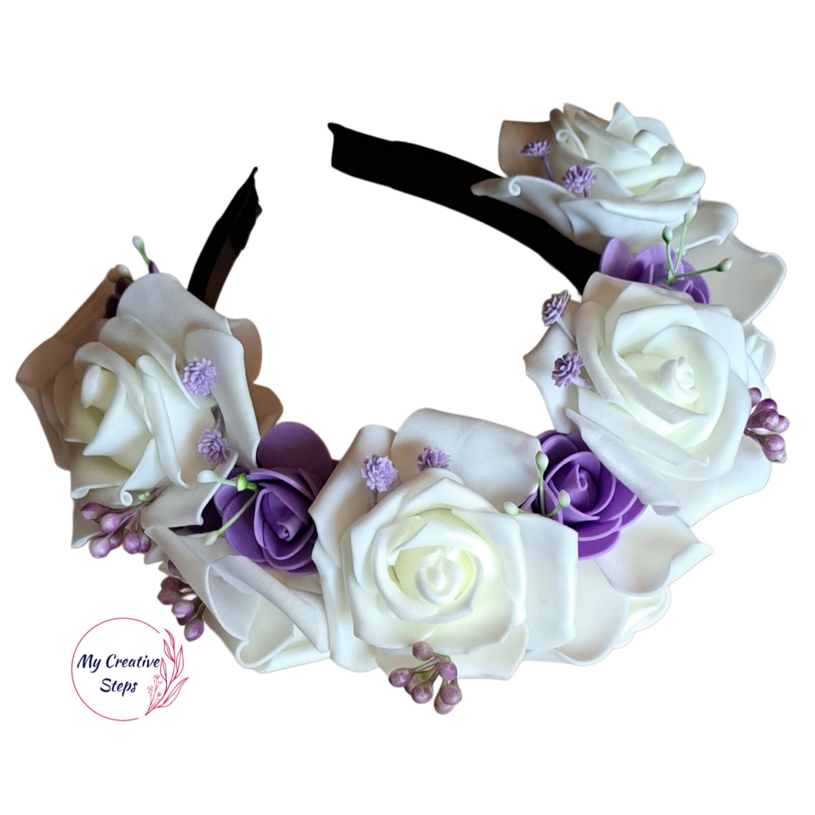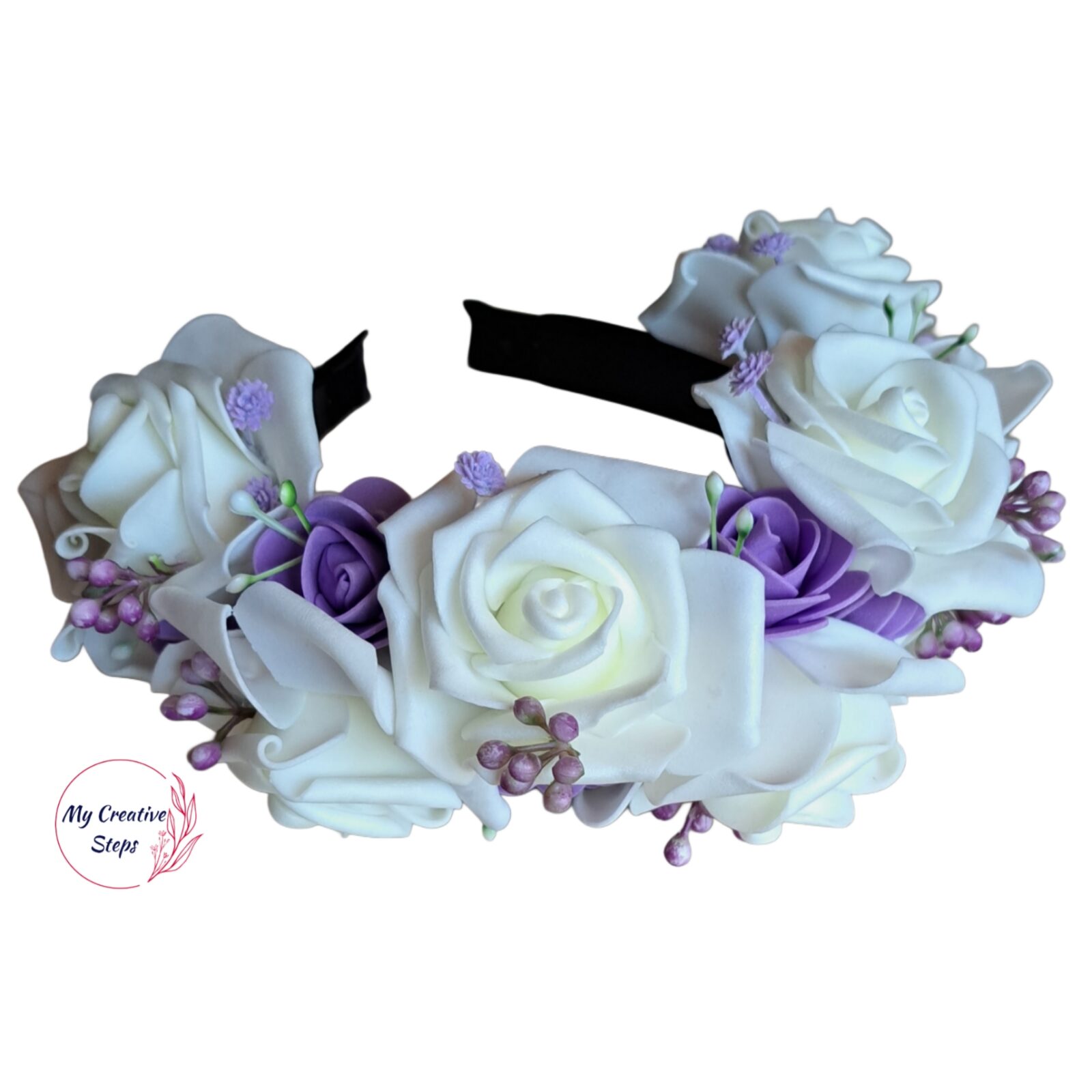 Coroniță dublă handmade cu trandafiri albi și lila.
