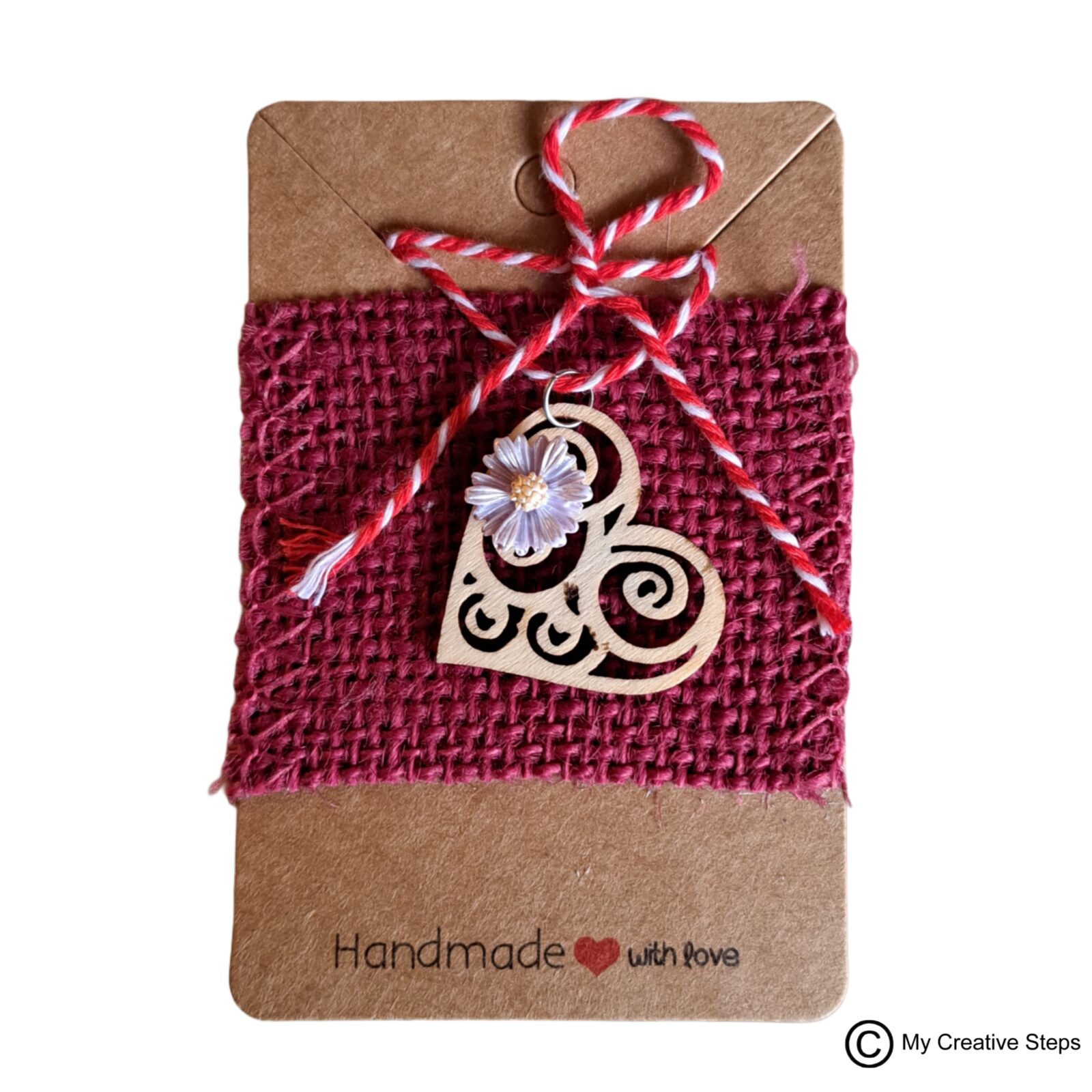 Mărțișor handmade cu floricică de culoare lila deschis pe inimioară de lemn traforat. Dimensiuni aprox. 3/3 cm.