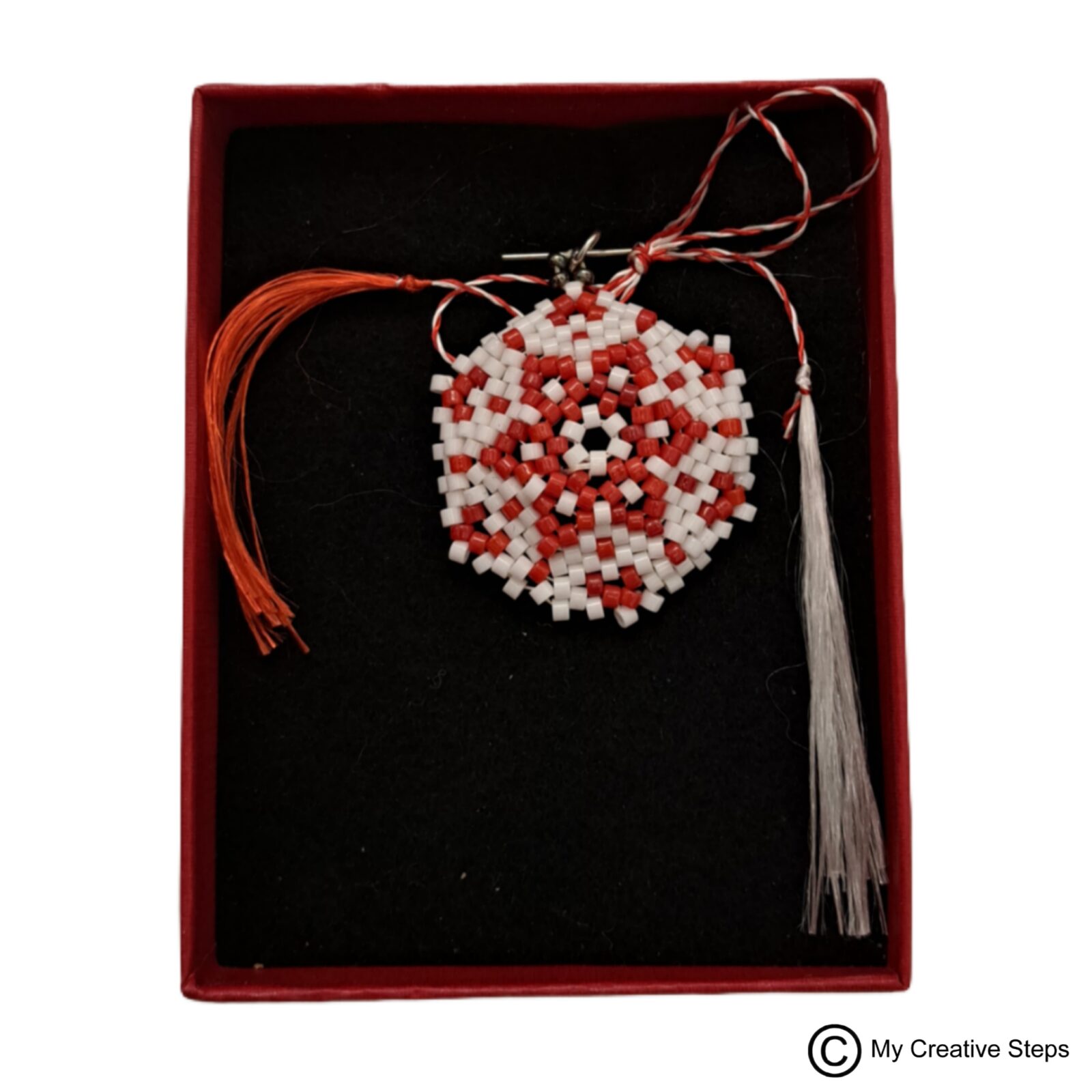 Mărțișor pandantiv handmade din mărgele albe și roșii. Diametru aprox. 3.5 cm.