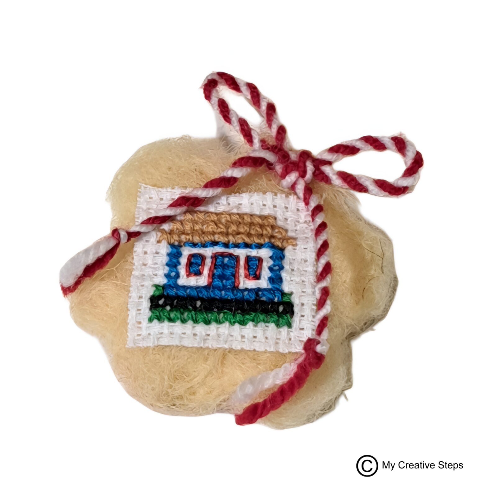 Mărțișor/Suvenir artizanal căsuță tradițională, cusut manual. Diametru aprox. 6 cm.