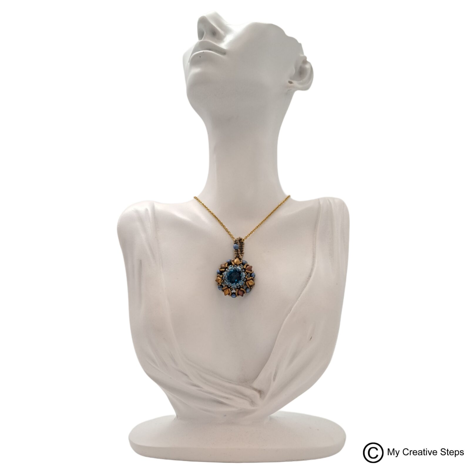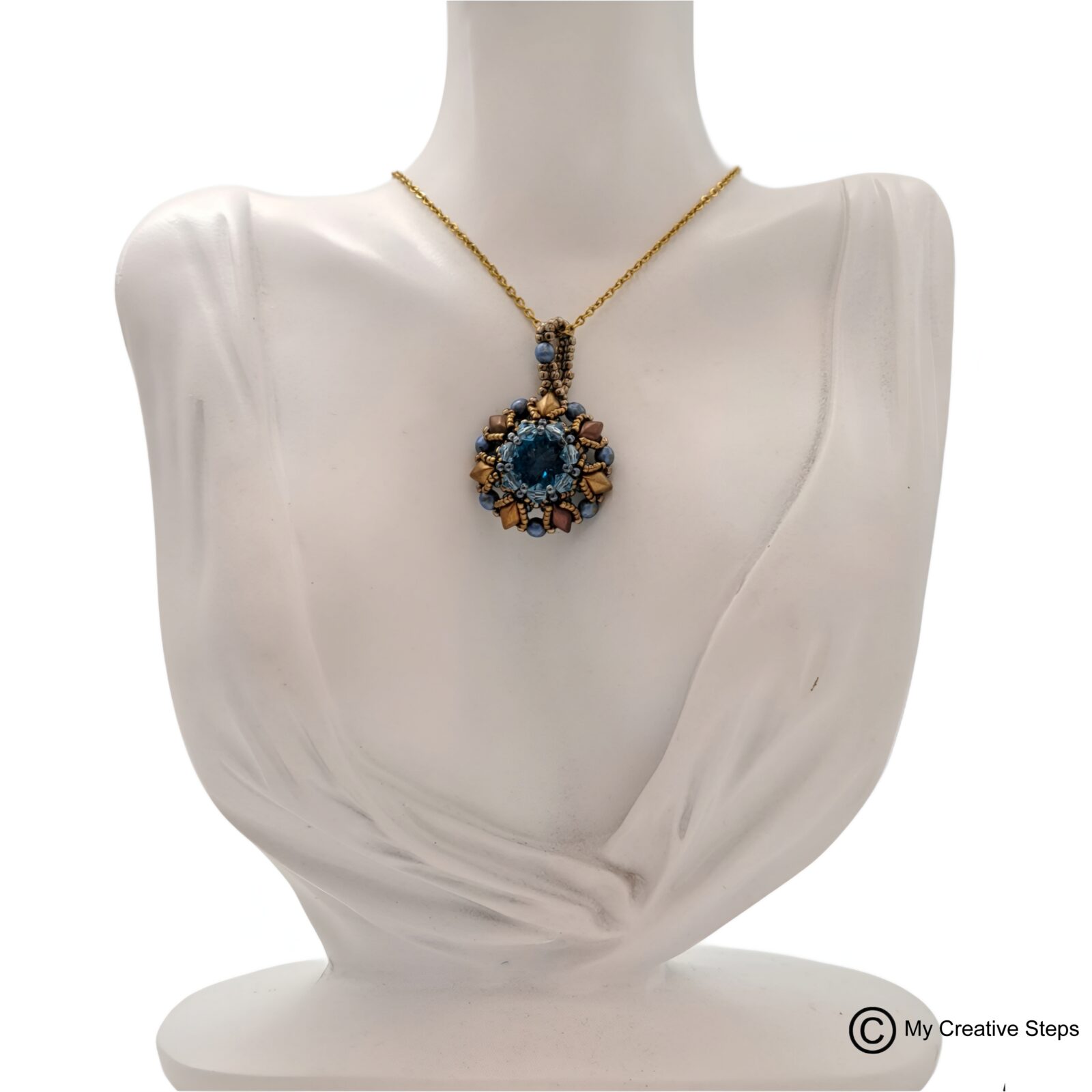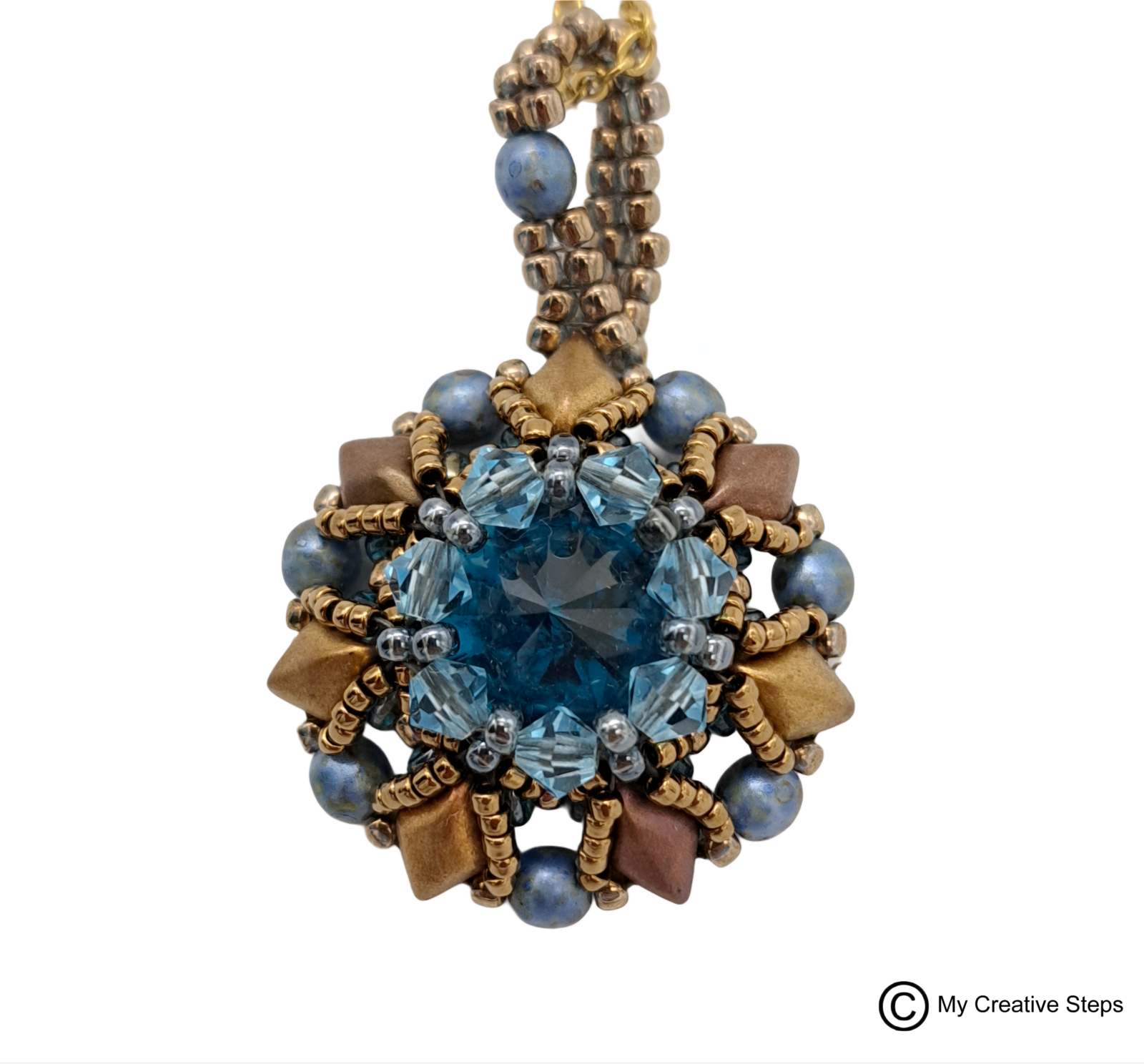 Colier handmade „elegant” cu pandantiv realizat din rivoli de sticla, mărgeluțe japoneze Miyuki, mărgele Fire-Polish și mărgele de sticlă de calitate superioara, fabricate in Cehia, gama Czech Mates, gemduo și lanț din INOX. Lungime aprox. 5 cm, lățime 3 cm.