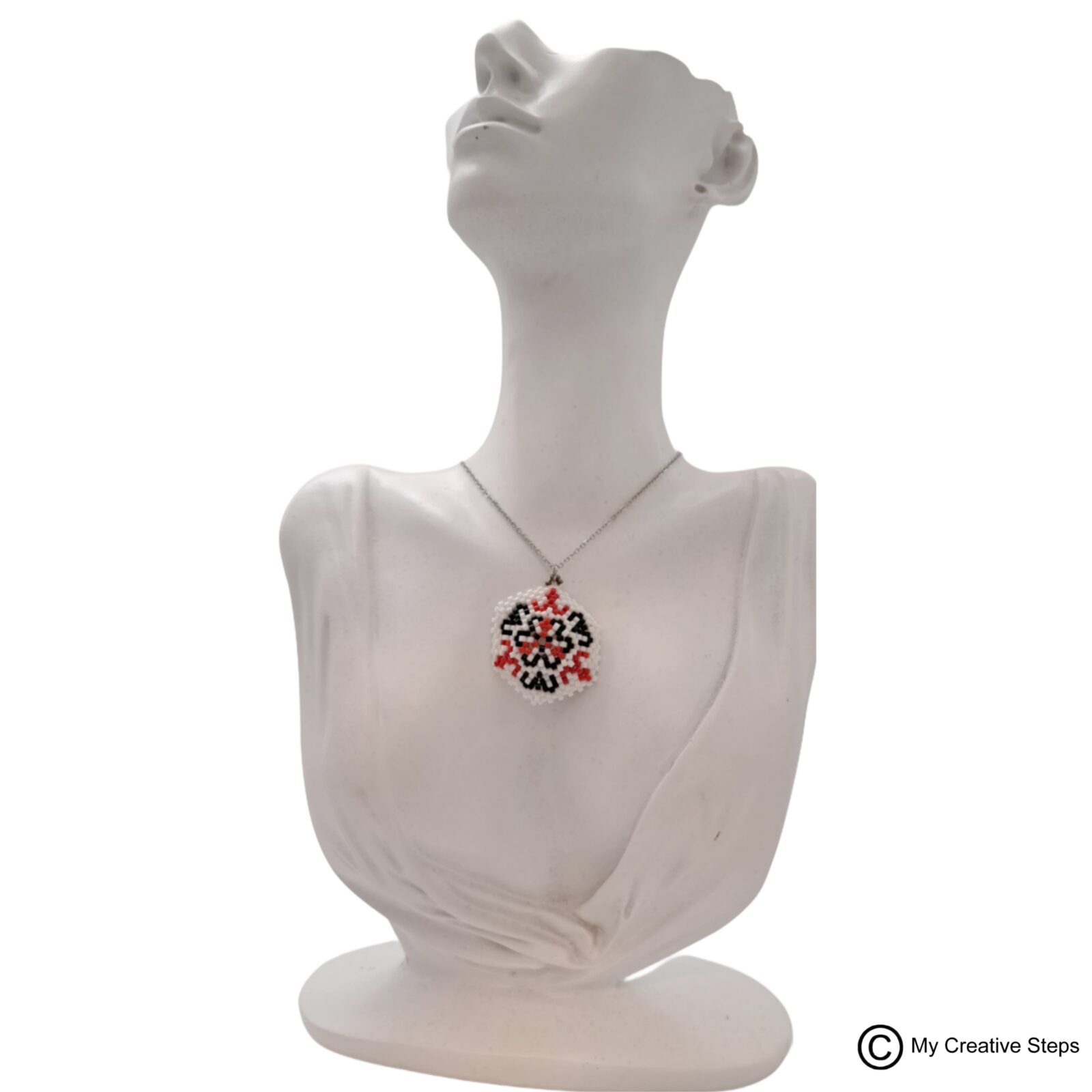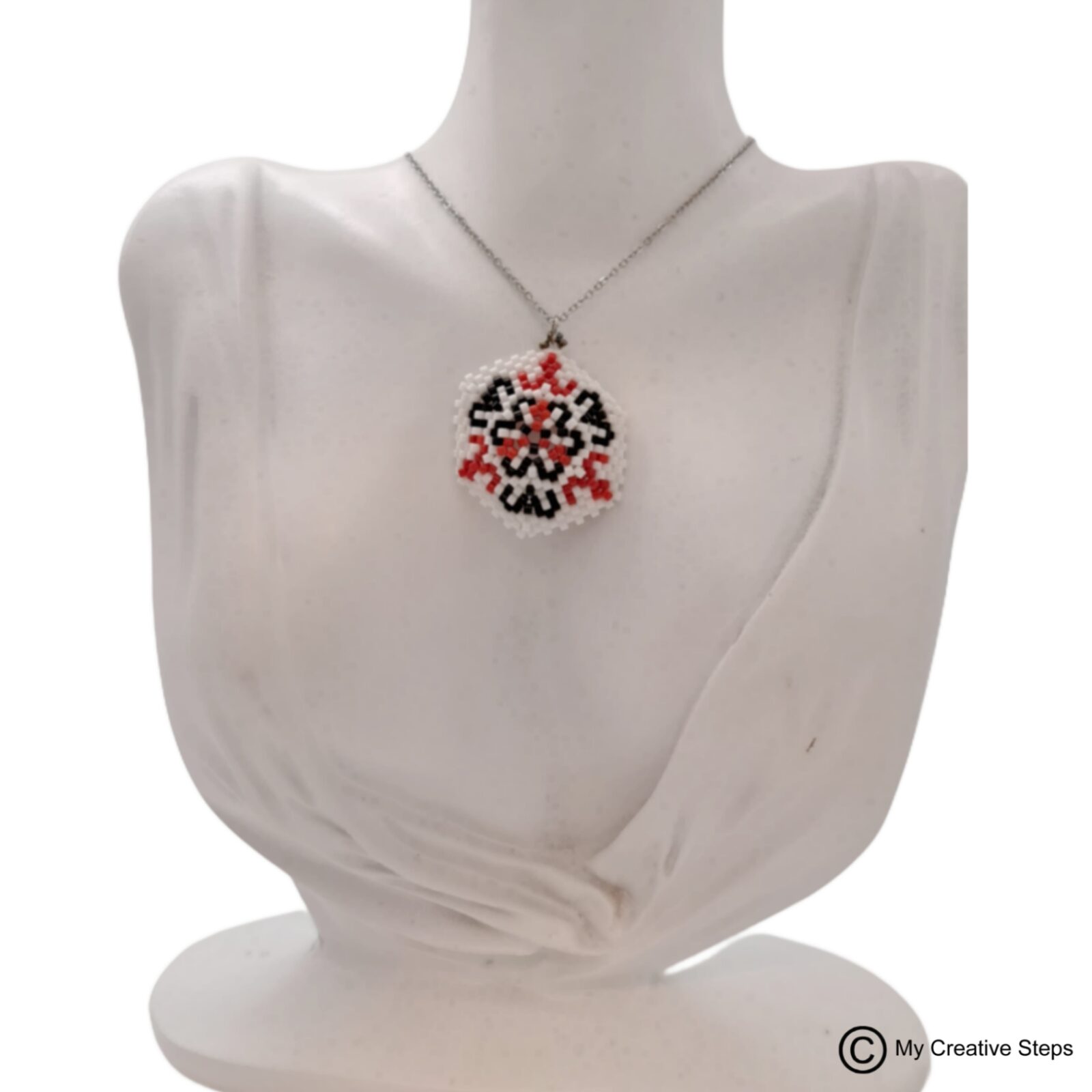 Pandantiv handmade cu modele tradiționale și lanț din INOX. Diametru pandantiv aprox. 3.5 cm.