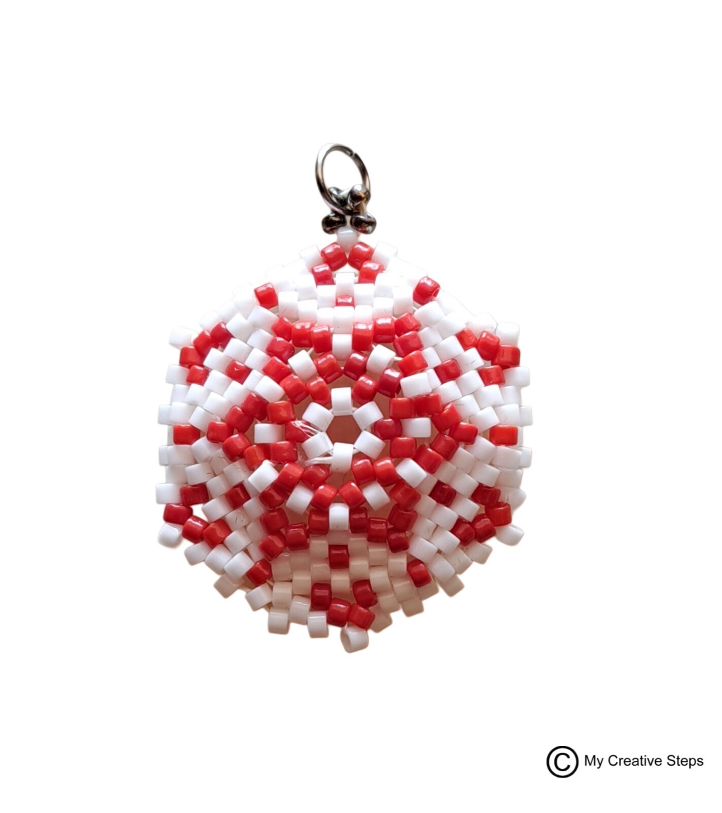 Pandantiv handmade din mărgele albe și roșii. Diametru aprox. 3.5 cm.